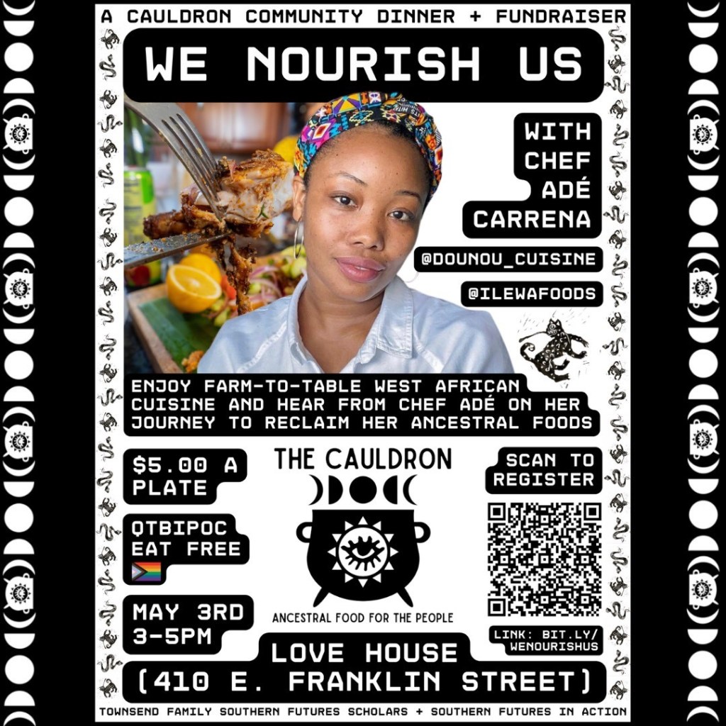 As a member of the 2022-23 cohort of UNC Southern Futures Scholars, I co-organized a community dinner and fundraiser for The Cauldron, a food justice organization serving QTBIPOC communities. At this event, attendees heard from Chef Ade Carrena and Dr. Sharon Holland about the healing power of ancestral foods. May 3rd, 2023, Chapel Hill, NC.